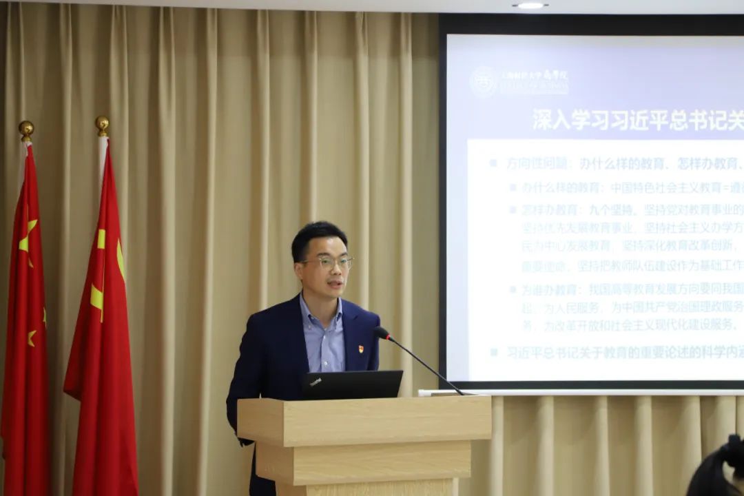 商学院常务副院长魏航围绕习近平总书记关于教育的重要论述这一主题进行了领学。他结合党的二十大报告、习近平在全国教育大会上的重要讲话、习近平在哲学社会科学工作座谈会上的讲话等内容,带领大家深入学习习近平总书记关于教育的重要论述的科学内涵和精神实质,深刻理解教育工作的方向性、根本性、全局性、战略性的问题。同时,他结合习近平总书记在考察中国人民大学考察时强调的“加快构建中国特色哲学社会科学,归根结底是建构中国自主的知识体系”,聚焦“建构中国自主商学知识体系”这一主题,分享了相关思考。