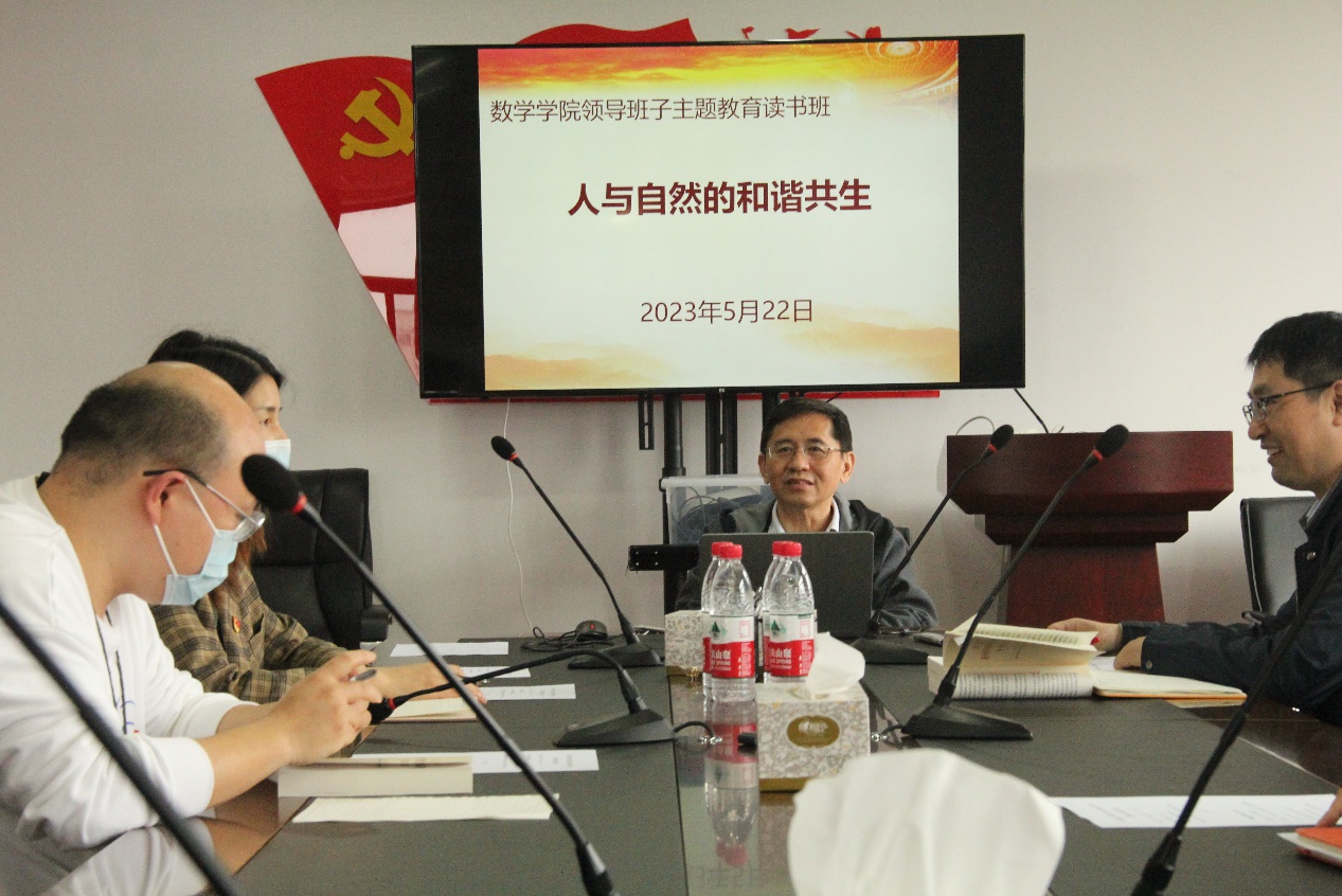 5月22日下午,数学学院领导班子学习贯彻习近平新时代中国特色社会主义思想主题教育读书班在红瓦楼826会议室就“坚持人与自然和谐共生”进行学习研讨。学院党委副书记刘福忠主持会议,院长程晋领学,副院长王燕军、院党委委员江渝、专职组织员张雁参加会议。