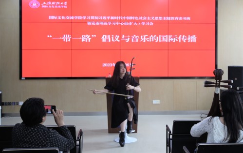 今年5月,结合学习贯彻习近平新时代中国特色社会主义思想主题教育,学院党委启动党建引领国际学生讲好中国故事项目。学习会现场,来自“一带一路”沿线国家的20余名国际学生也共同聆听了辅导报告。来自马来西亚的侯妍嫣在报告最后演唱了国际文化节主题曲《四海同心》,她表示,“今天的报告很好的诠释了‘四海一家’的理念,作为马来西亚华裔,我很高兴能够进一步学习习近平总书记提出的‘一带一路’倡议。倡议提出以来,中国和马来西亚的经贸和人文交流不断加深,最直接的表现就是我们学校来自‘一带一路’沿线国家的留学生也越来越多。”学院党委正处级专职组织员蔡蓉表示,“张天老师引经据典,民乐团的同学现场演奏,带我们走进了被称为贸易之路友谊之路的古丝绸之路,沉浸式的教育方式使我们更深刻地理解了以共同发展、共同繁荣为第一要义的“一带一路”的倡议。”