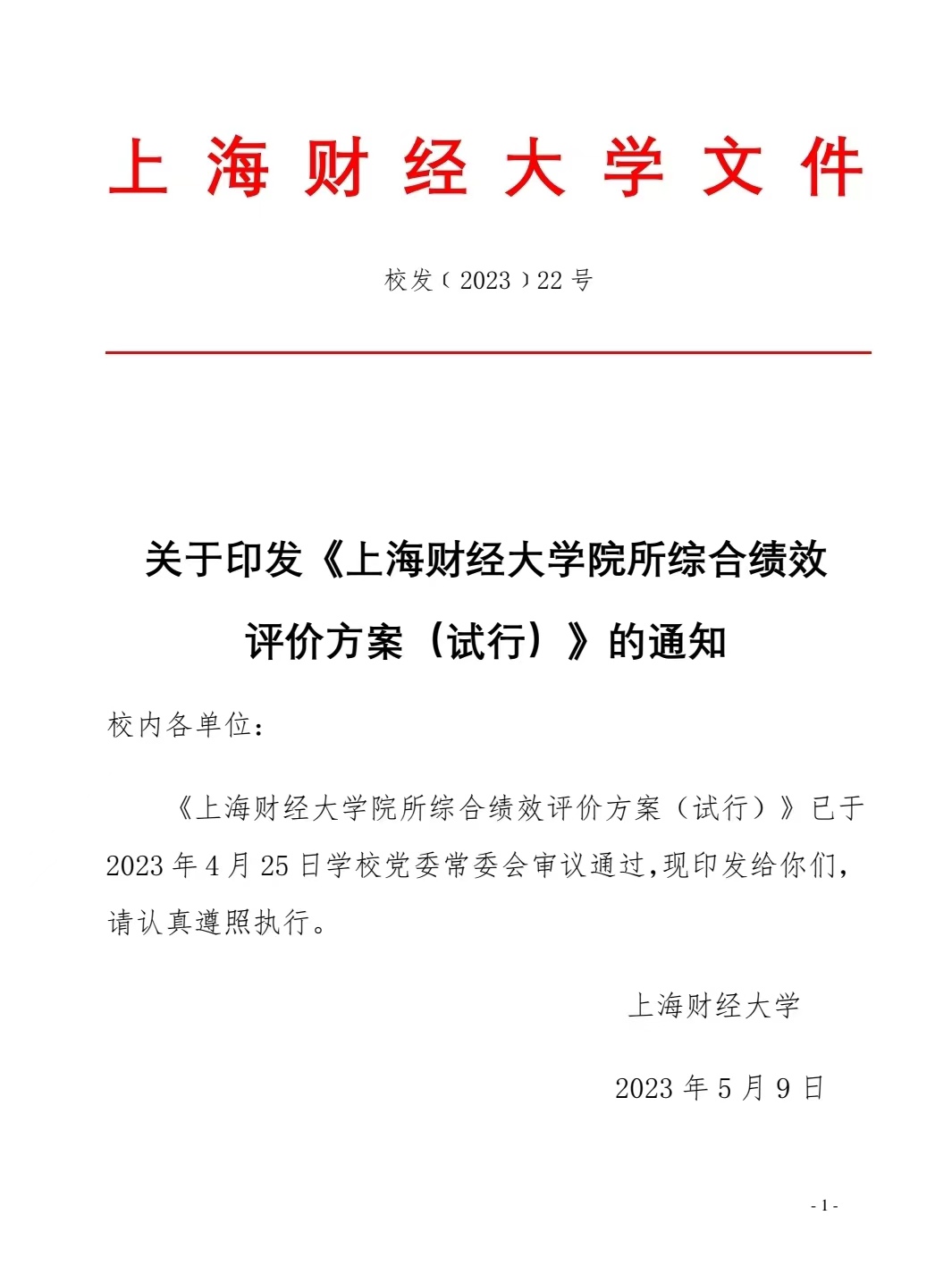 2023年1月10日,学校印发《上海财经大学关于深化校院两级财务管理体制改革的实施方案(试行)》的通知,提出深化“放管服”改革,完善校院两级财务管理体制,理顺校院两级财经关系,其中一项改革举措即是实施院所综合绩效评价。