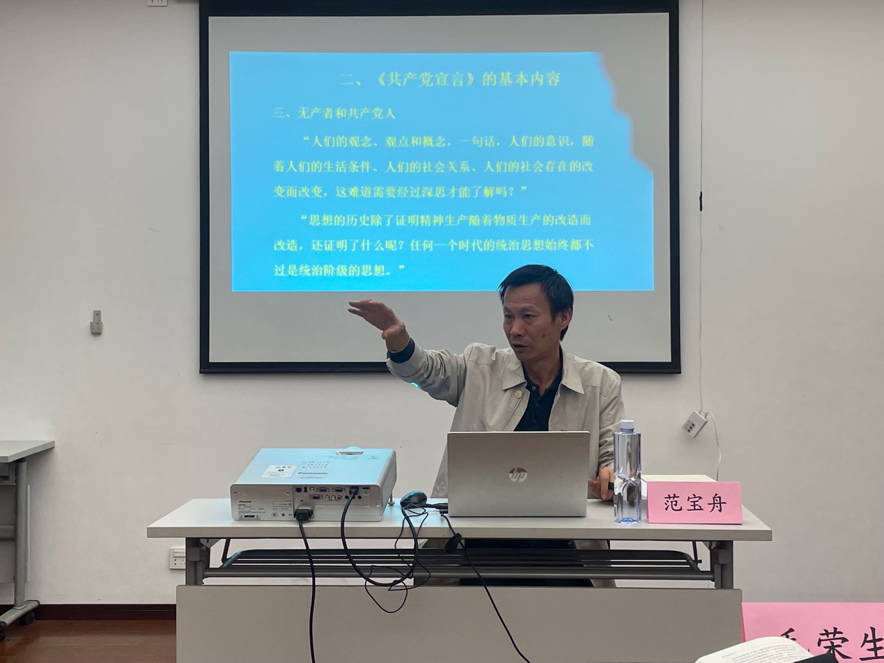 紧接着,人文学院党委书记范宝舟教授为同学们作了主题为“秉持初心·恪守信念”的《共产党宣言》导读。范书记首先讲解了马克思恩格斯在《共产党宣言》中对资本主义发展历史的阐述,强调《共产党宣言》对于现代社会经济生活的重要指导意义。范书记向同学们讲述了十九世纪欧洲共产主义运动的产生原因、发展历史和社会矛盾,指出国际共产主义运动在发展过程中尽管遇到诸多艰难曲折,但共产主义社会的最终实现是人类历史的必然。范书记还向同学们介绍了青年马克思和恩格斯的思想转变过程,马克思和恩格斯创立新的世界观过程中所遇到的实际问题,分析了《共产党宣言》的内容架构和思想由来。