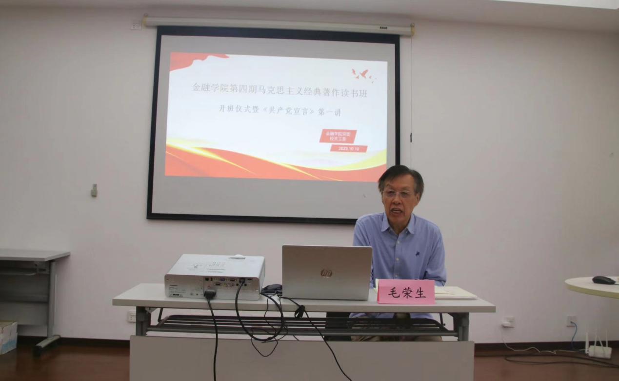 上海财经大学金融学院党委与校关工委合作,先后举办了三期马克思主义经典著作读书班,组织学生党员和发展对象研读 《共产党宣言》等经典著作,提高学生党员和发展对象的理论修养,增强党性观念,着力提升运用马克思主义基本原理解决实际问题的能力和水平。2023年10月10日下午,金融学院第四期马克思主义经典著作读书班在武东路校区毓秀楼开班。人文学院党委书记范宝舟,校关工委常务副会长毛荣生,公共经济与管理学院党委书记、金融学院党委副书记秦文佳,校关工委秘书长郭保华,金融学院特邀党建组织员马善新,金融学院党务秘书王绚,金融学院全体预备党员出席本次开班式。活动由金融学院专职组织员李书华主持。