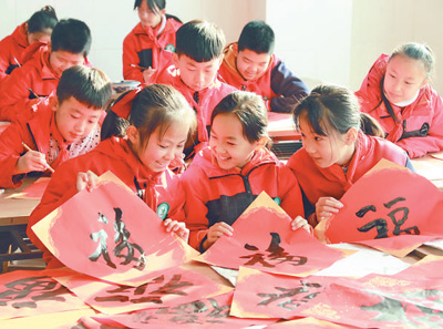 深入实施义务教育阶段“双减”,推动校内教育提质增效,抓好校外培训治理,营造良好教育生态。图为2022年1月,山东省高密市第四实验小学的小学生在晒自己书写的“福”字,迎接“双减”后的首个寒假。