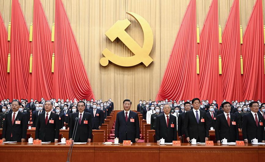 10月16日,中国共产党第二十次全国代表大会在北京人民大会堂开幕。这是习近平、李克强、栗战书、汪洋、王沪宁、赵乐际、韩正、胡锦涛在主席台上。新华社记者 李学仁 摄