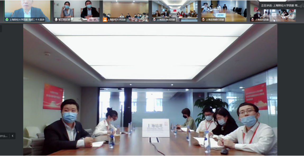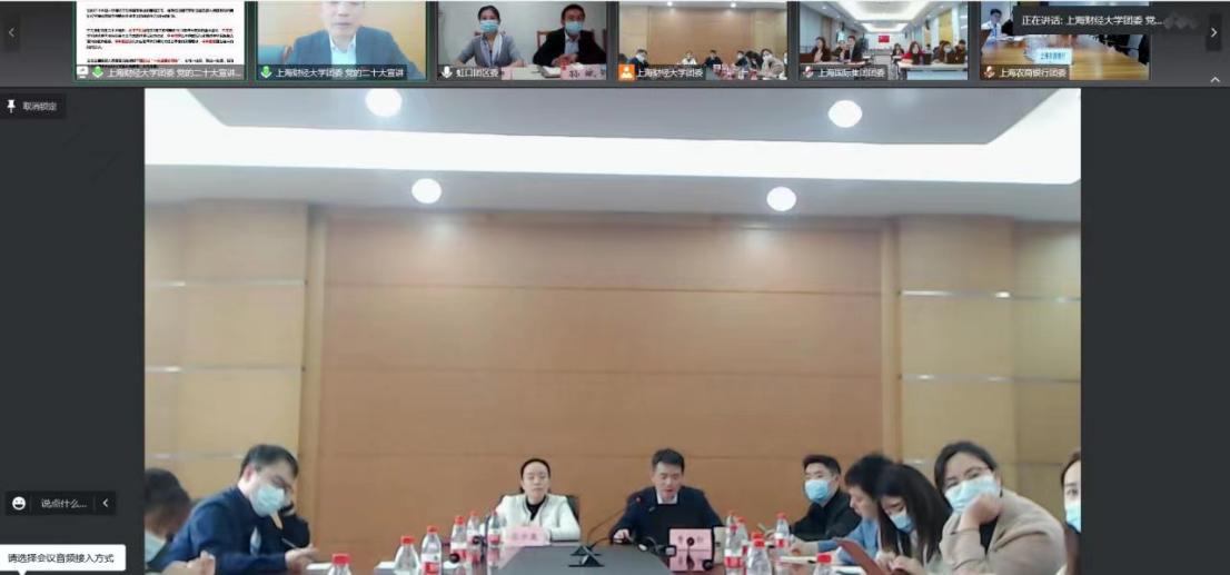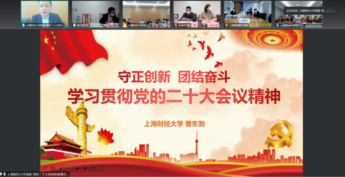11月4日下午,我校团委与杨浦团区委、虹口团区委、上海国际集团团委、上海农商银行团委、上海国际信托集团团委以线上线下相结合的方式联合举办“区、企、校”共青团组织党的二十大精神联学活动。活动邀请到上海市青年讲师团成员、上海财经大学党校副校长、马克思主义学院教授曹东勃带来题为“守正创新 团结奋斗——学习贯彻党的二十大会议精神”的主题讲座。讲座于学校大学生活动中心中庭会议室举行,上海财经大学校、院两级团干部现场参与了此次活动,各联学单位团委书记班子、青年团干线上参加学习,活动由校团委书记沈亦骏主持。