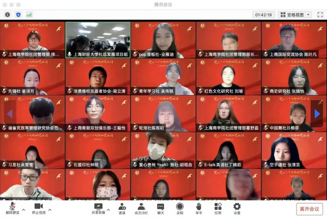 11月4日,校团委社团总会邀请上海市青年讲师团成员,我校马克思主义学院刘洋老师为同学们带来以“全面建设社会主义现代化国家的行动纲领——党的二十大精神学习体会”为主题的宣讲报告。社团总会组织我校各学生社团核心管理层参加讲座,还创新学习形式,开展联建联学活动,邀请上海商学院学生社团骨干100余人一同线上参与了此次学习。