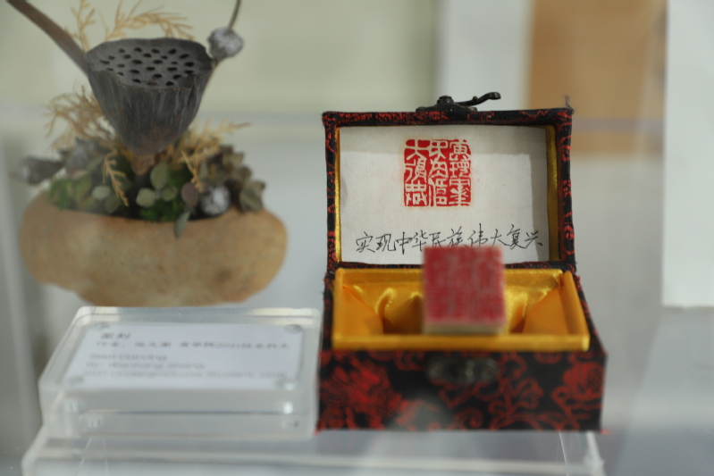 为庆祝党的二十大胜利召开以及上海财经大学建校105周年,我特意创作了一方印章。印文为:“实现中华民族伟大复兴”。这一创作对我来说是很大的一次考验,如何在仅仅方寸的章料上安排这十个字对我来说是很有挑战性的。为了创作这方印章,我专门前往上海博物馆观看了历代名家的印章,并从汉印中汲取灵感。以浑厚沧桑的白文象征民族复兴是根植于中华历史的夙愿,表达我真挚的情感。