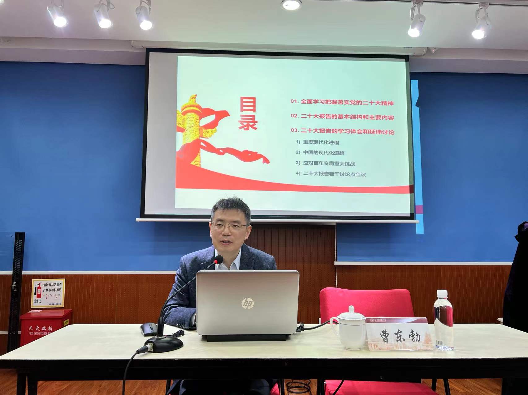曹东勃从全面学习把握落实党的二十大精神、二十大报告的基本结构和主要内容、过去五年的工作和新时代十年的伟大变革三个大方面,深刻解读二十大精神、深入剖析二十大报告。