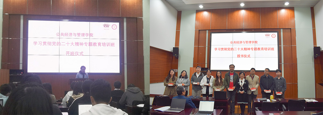 在公共经济与管理学院学习贯彻党的二十大精神专题教育培训班开班仪式上,方芳书记将学院党委为每一位师生党员配发的《中国共产党章程》、《党的二十大报告学习辅导读本》、《党的二十大报告学习辅导百问》等专题学习资料授予各党支部,希望每一位党支部书记做好领读、每一位党员师生做好精读。周巧副书记介绍了学校党委、宣传部、组织部关于党的二十大精神学习的相关要求和任务,学院党委将以“学习二十大 公管在行动”为主题开展系列活动来学习宣传贯彻党的二十大精神,学院师生要牢牢把握党的二十大精神的丰富内涵,切实把思想和行动统一到党的二十大精神上来,把智慧和力量凝聚到党的二十大确定的各项任务上来。