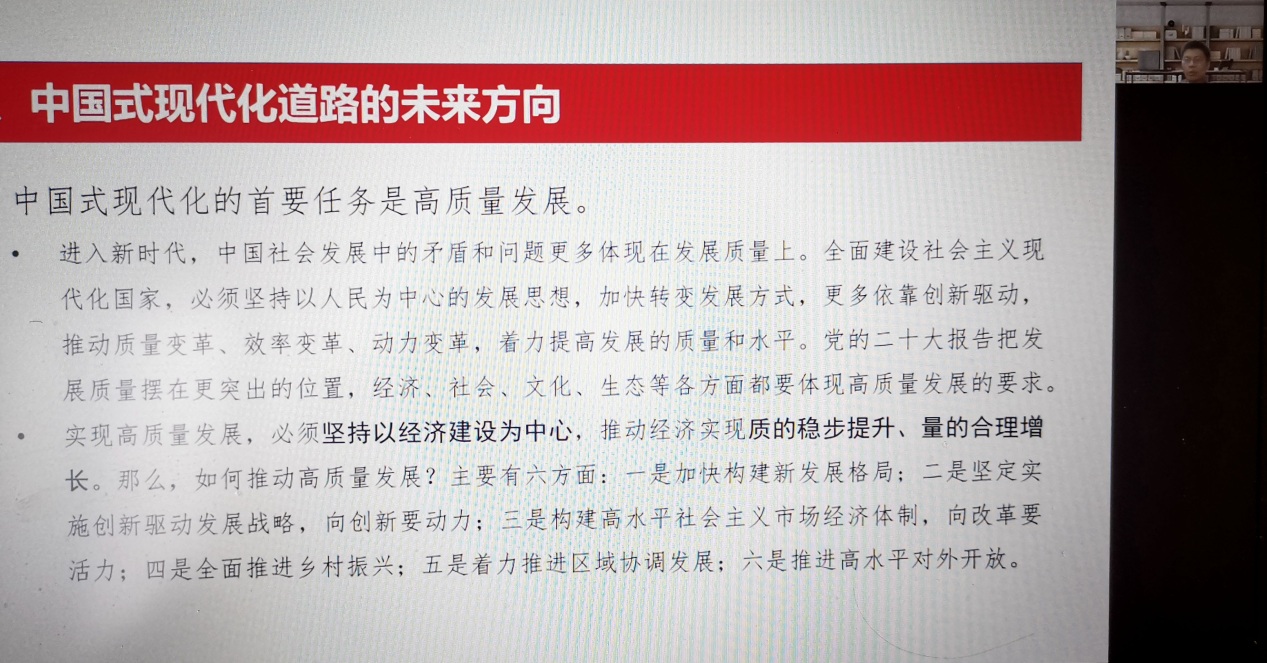 11月13日,党校邀请中国经济思想发展研究院陈旭东副研究员作《从经济维度看中国式现代化的历史与未来》专题报告,他对党的二十大报告关于中国式现代化进行了论述,阐释了中国共产党的中心任务、中国式现代化的主要特征和中国式现代化的本质要求,重点从经济维度为学员们分析了中国现代化进程历史、现实和未来方向。