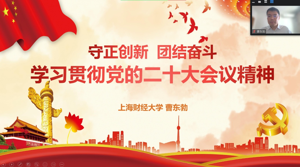 为深入学习领会党的二十大精神,贯彻落实新时代党的建设总要求,切实提升党员发展质量,激励师生入党积极分子、发展对象、预备党员以更加昂扬的姿态奋进新征程,11月6日至26日,上海财经大学党校举办了“自信自强·踔厉奋发·学习贯彻党的二十大精神”2022年第2期师生入党积极分子、发展对象、预备党员培训班。全体师生学员850余人参加了本期学习活动,培训课程在线上集中进行,党校副校长、党委组织部副部长曹东勃主持开班活动并作《学习贯彻党的二十大会议精神》首场辅导报告。