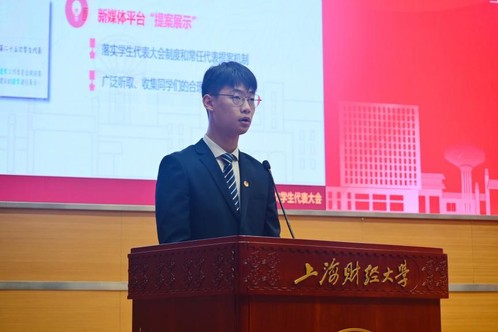 陆嘉雯同学作为提案工作组负责人,代表本次大会筹备委员会向学生代表们汇报了大会提案工作,总结了本次学生提案征集与反馈情况。本次大会的提案工作充分发挥学生代表大会制度优势,传递治理建议,有力展示了学生代表们积极参与校园治理、充分行使民主权利的责任与担当。