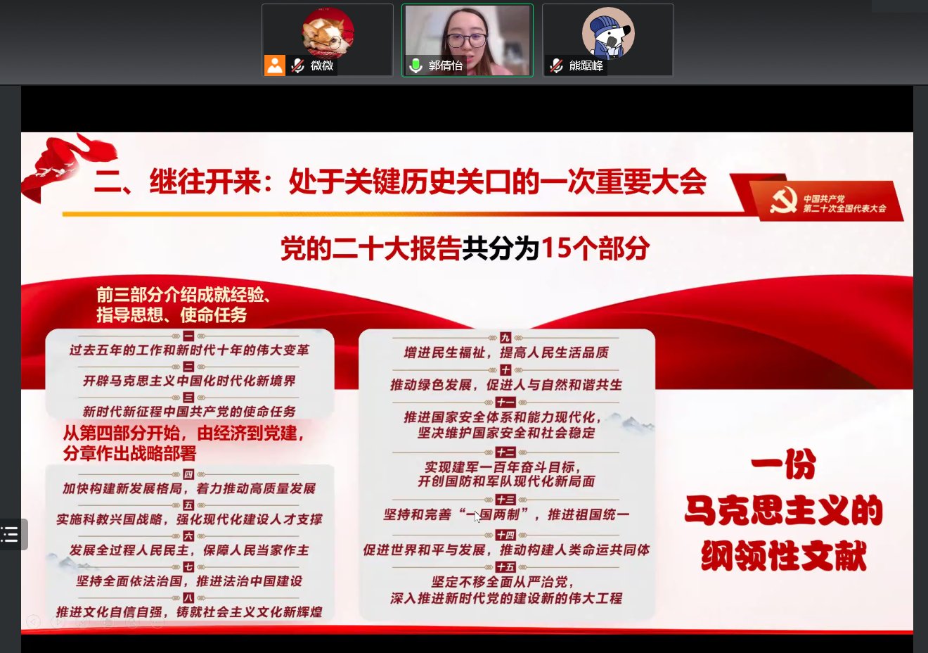 为深入学习宣传贯彻党的二十大精神,12月16日下午,上海财经大学公共经济与管理学院特邀校“至诚”辅导员宣讲团开展党的二十大精神主题政治理论学习活动。公管学院辅导员郭倩怡老师和统计与管理学院辅导员熊踞峰老师作为宣讲团成员代表,以线上直播的方式为公管学院全体教师及学生党员进行理论宣讲,活动由公管学院专职组织员王伏璐老师主持。