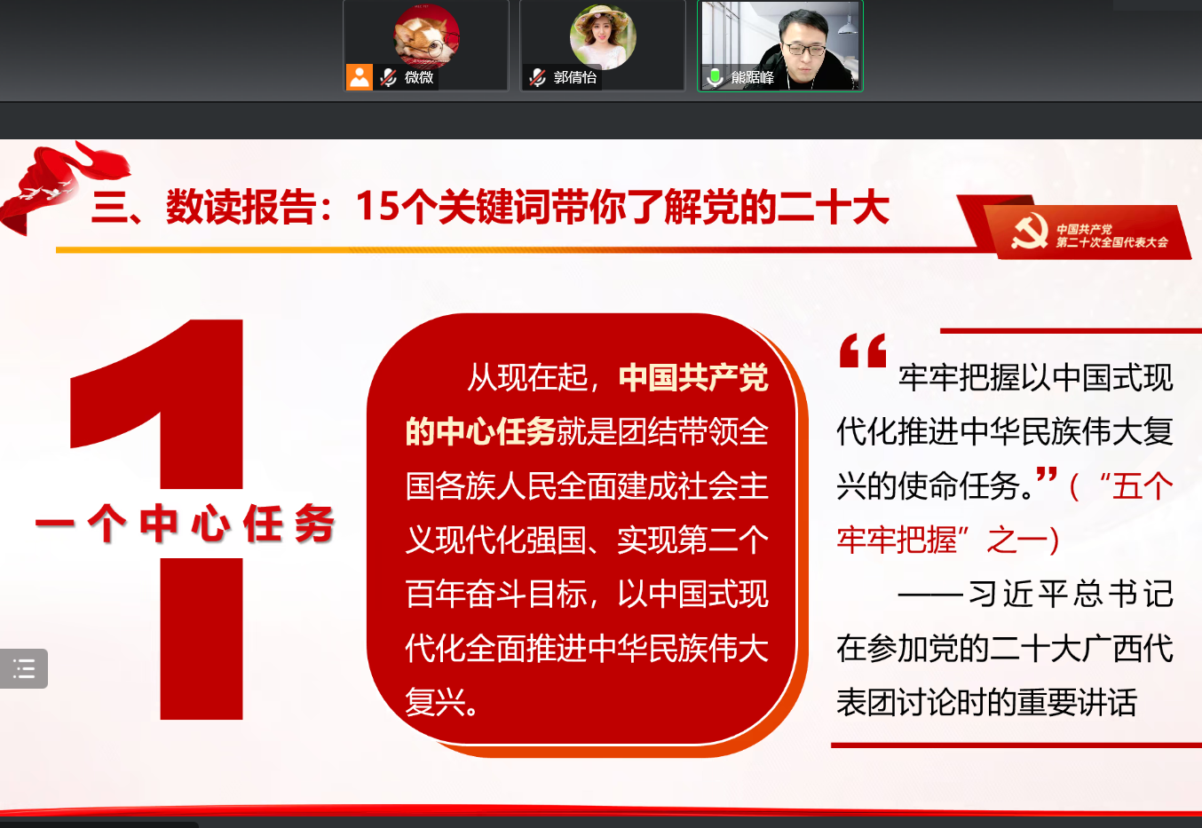 熊踞峰老师以“数读报告”的形式向参会师生详细解读了二十大报告,熊老师解读了15个关键数字,以独特的解读方式帮助师生快速把握二十大报告精神。数字“1”中的“一个中心任务”,作为二十大报告开篇的论述,在历代党代会报告中都具有鲜明的特征,二十大报告的重要改变是提出了“中国式现代化”。两个百年奋斗目标与中国式现代化紧密结合,相互推动。熊老师重点讲解了32字伟大建党精神:坚持真理、坚守理想,践行初心、担当使命,不怕牺牲、英勇斗争,对党忠诚、不负人民。我们要深刻理解伟大建党精神的内涵,并在行动中予以实践。