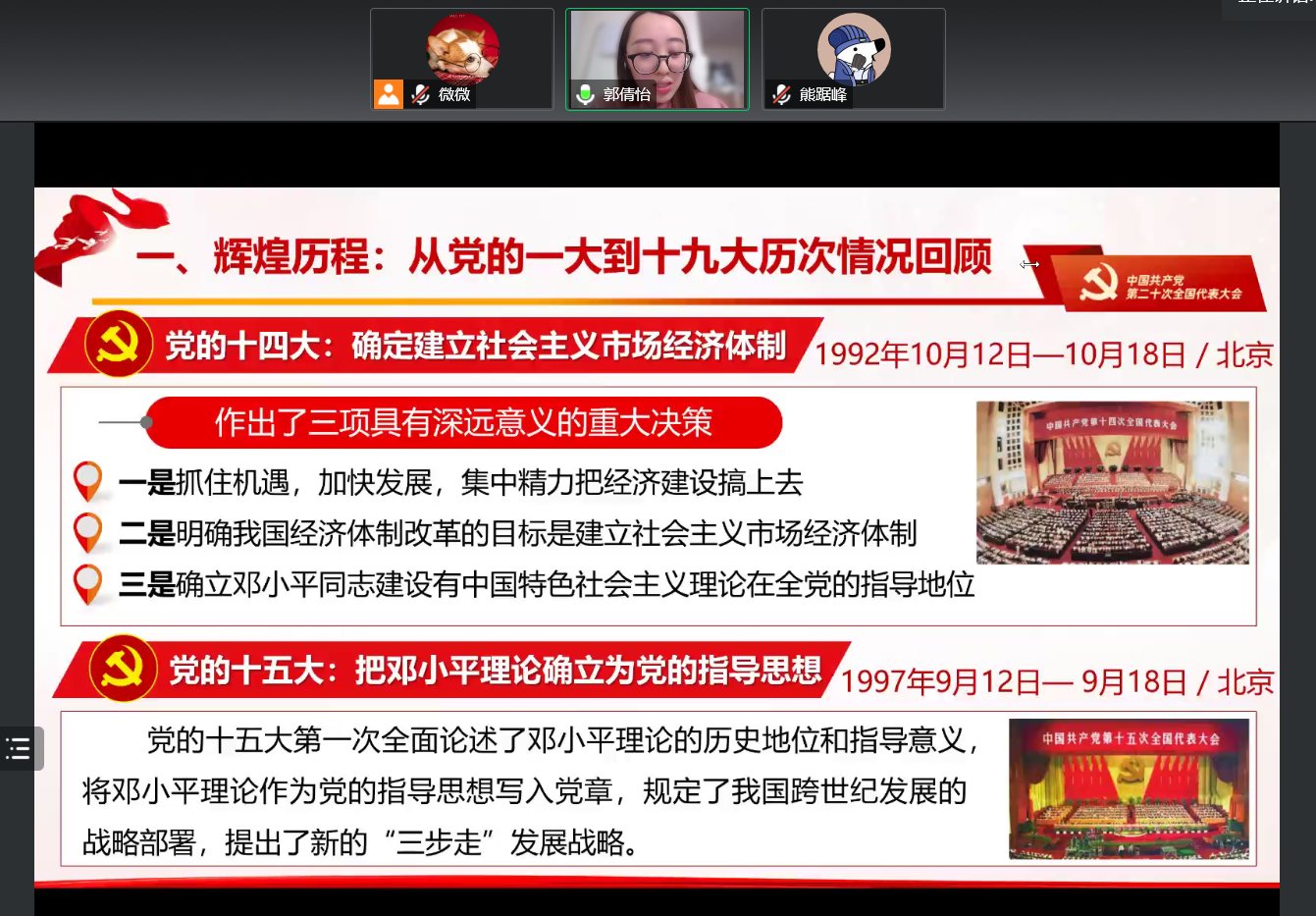 郭倩怡老师先就“辉煌历程”、“继往开来”两个板块进行宣讲。首先,她详细介绍了党的第一次代表大会至第十九次代表大会的“辉煌历程”,解读了中国共产党为什么从上海起源,党的章程、毛泽东思想等确立为党的指导思想的过程,梳理了数次党的代表大会所取得的成就,展现了中国共产党的百年光辉奋斗历程。随后,在“继往开来”的板块中,郭老师提到,党的二十大是处于关键历史关口的一次重要大会,是在全党全国各族人民迈上全面建设社会主义现代化国家新征程、向第二个百年奋斗目标进军的关键时刻召开的一次十分重要的大会,会议选举产生了新一届中央委员会、中央纪律检查委员会、修改了党的部分章程等,科学谋划了未来五年乃至更长时期党和国家事业发展的目标任务和大政方针。